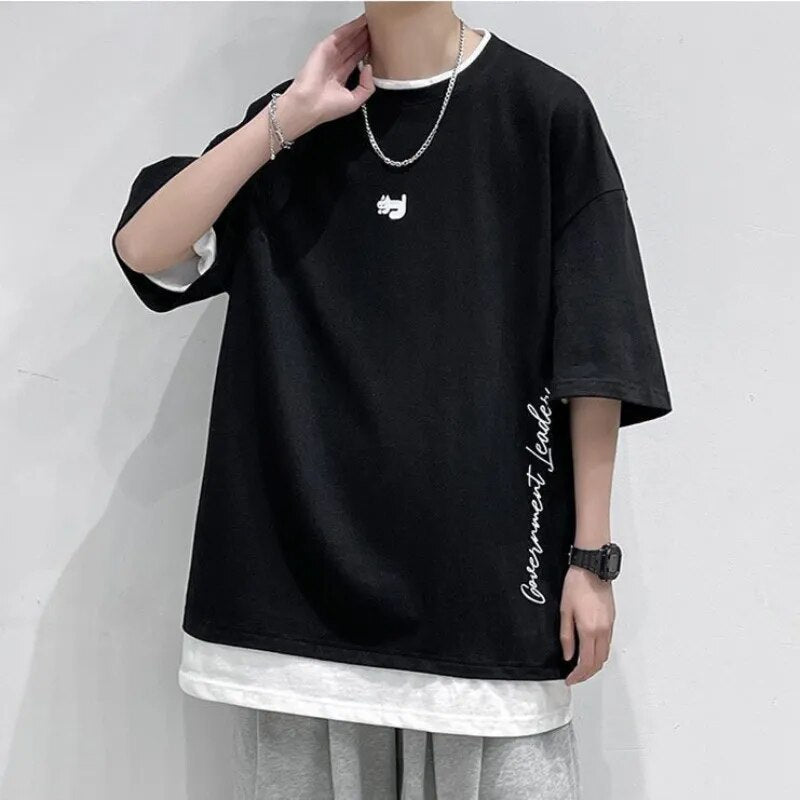 sanyamk Two Pieces T-shirt Men's Hong Kong Style Oversize O-Neck Panel Short Sleeve T-shirt Unisex Hip Hop Patch Design Top