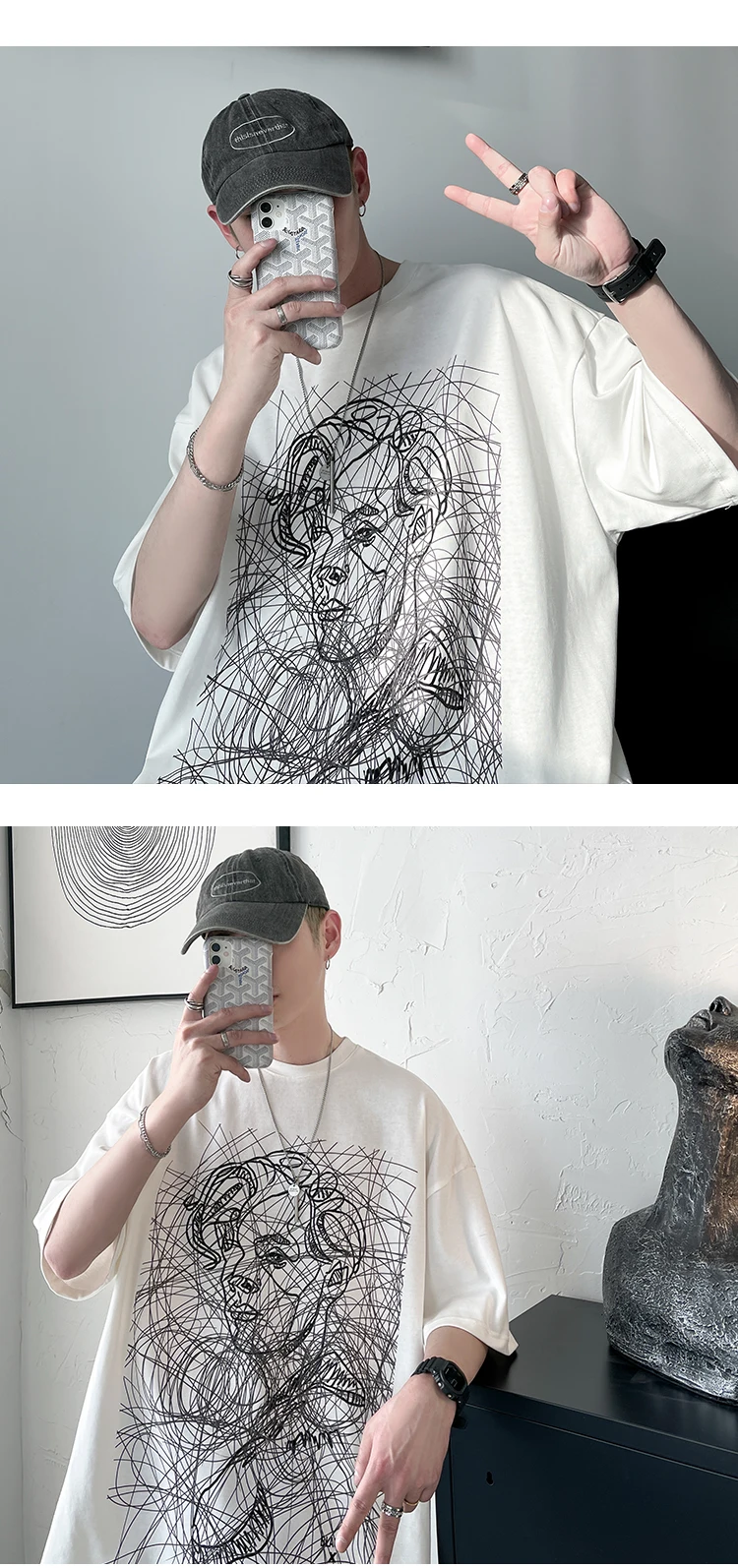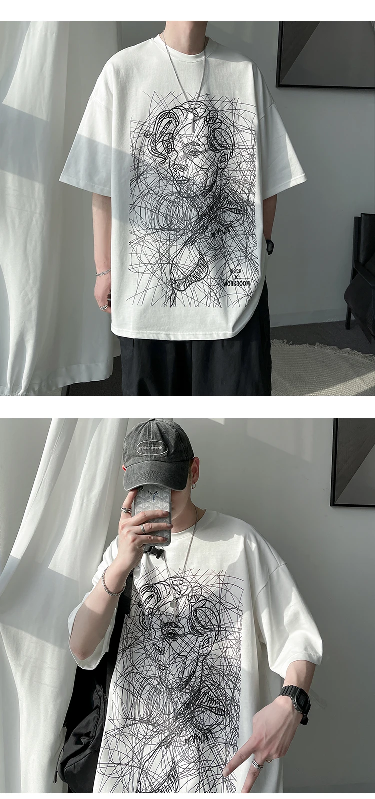 Bonsir Couple Large Size Loose Abstract Thread Character Short Sleeve T-Shirt Men's High Street Hip Hop Cotton White T-Shirt Top M-5XL