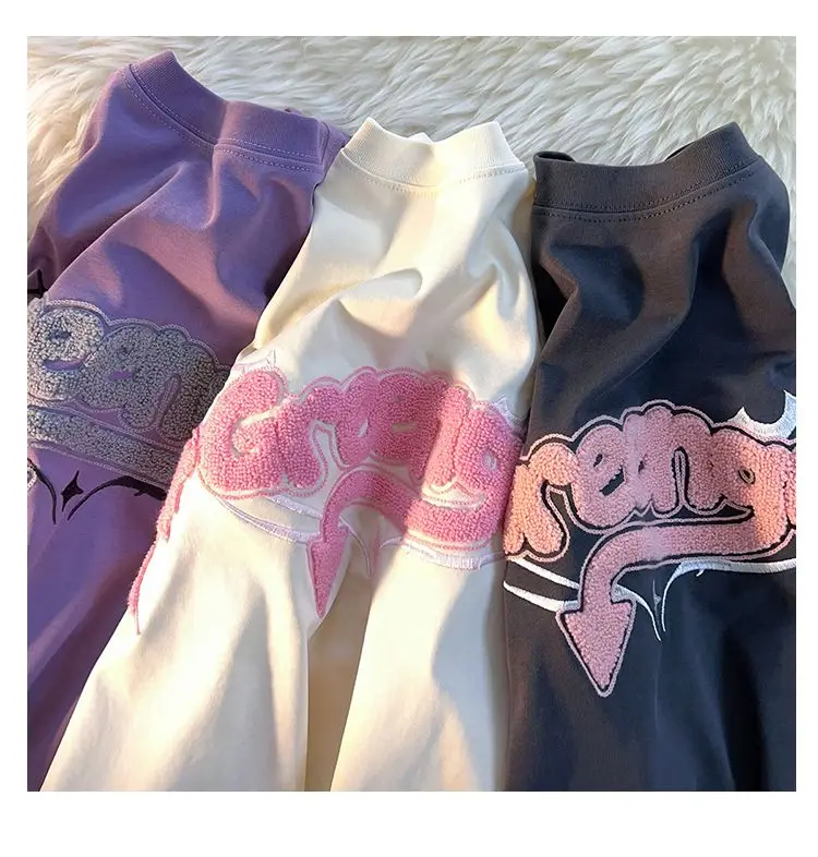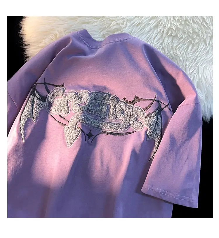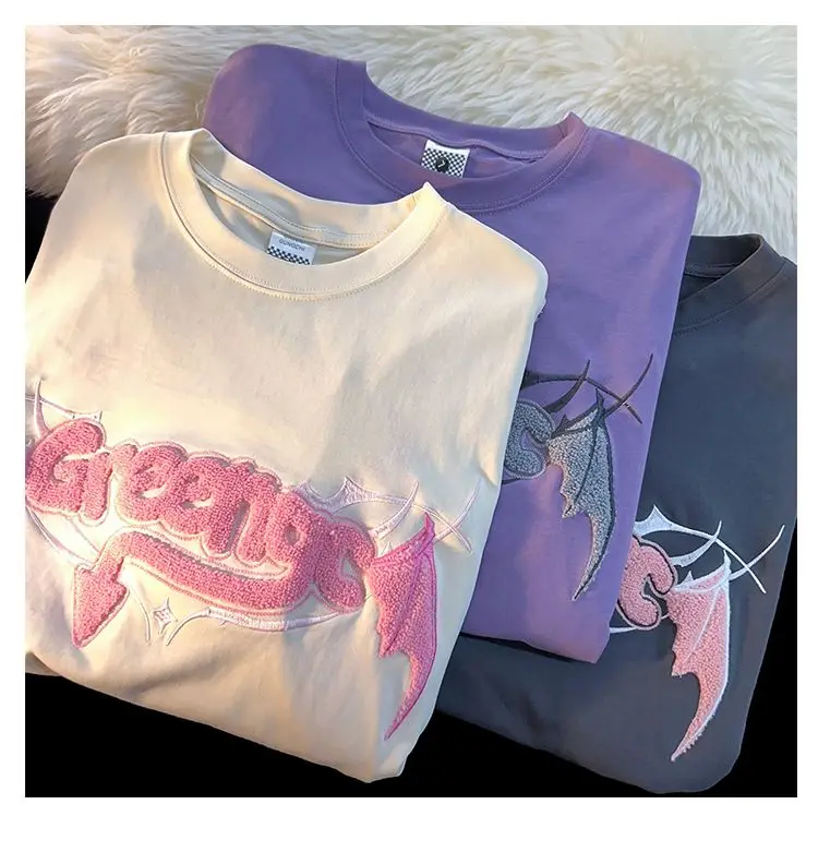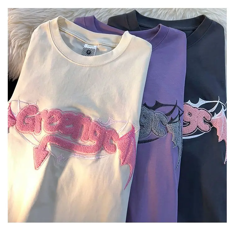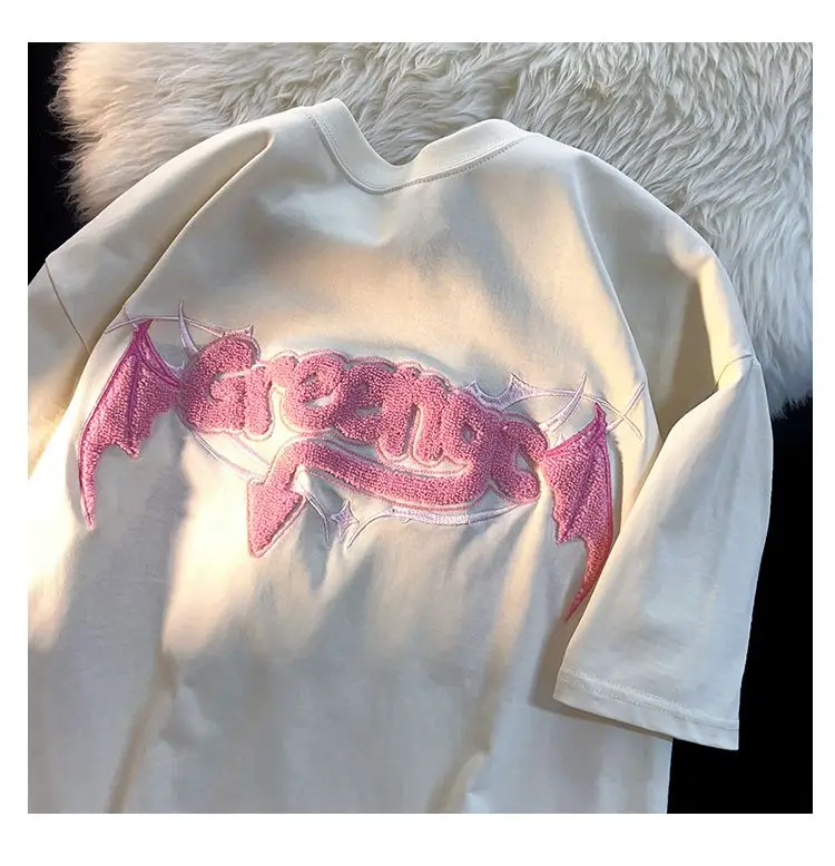 Bonsir High street men and women trendy hip-hop letters little devil wings round neck short sleeved couple loose casual T-shirt top y2k