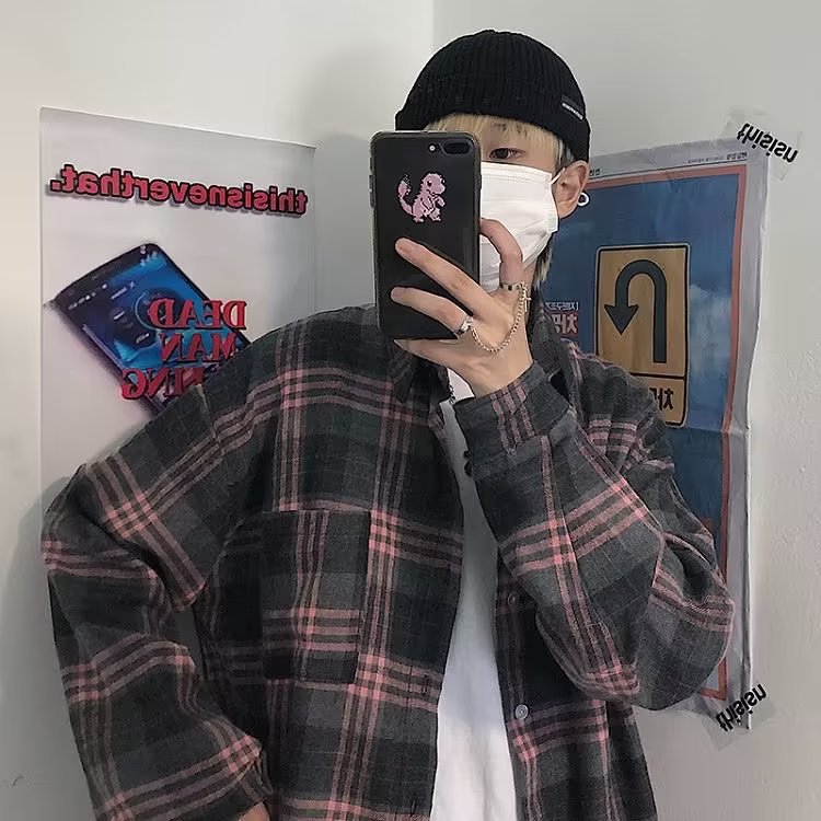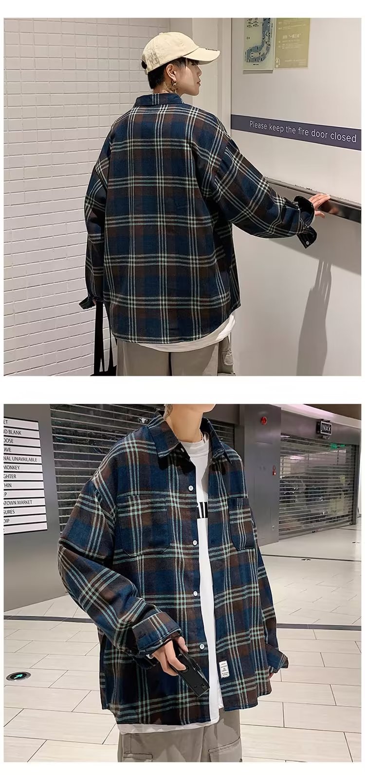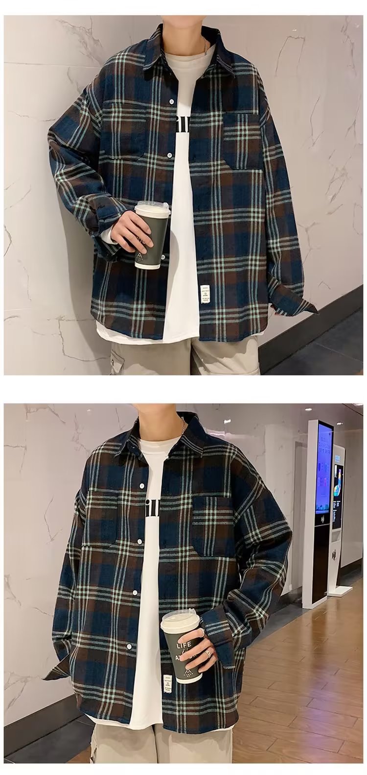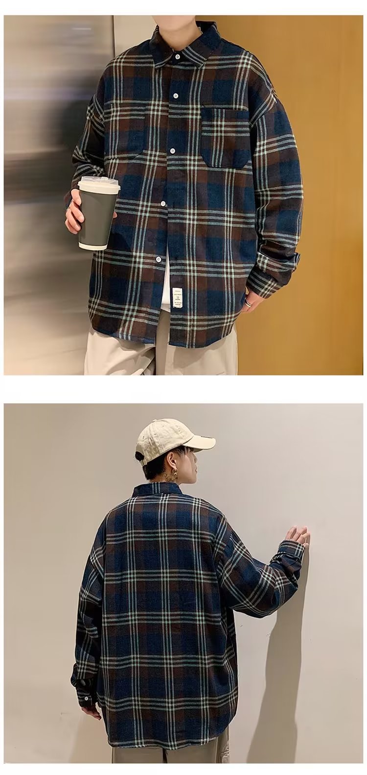 fall mens outfits Plaid Shirt Men's Long Sleeve Spring and Autumn Loose Retro Trendy Lazy Style Korean Style Ruan Handsome Inner Short Sleeve Shirt Jacket